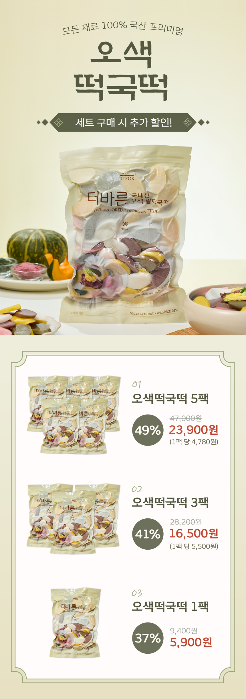 3. [최대 할인] 오색떡국떡 5팩 (23,900원, 49% 할인)